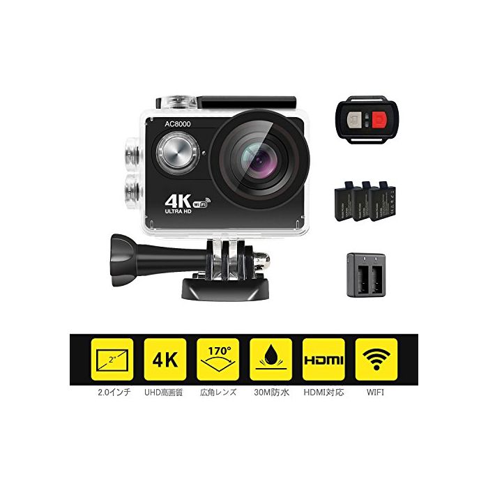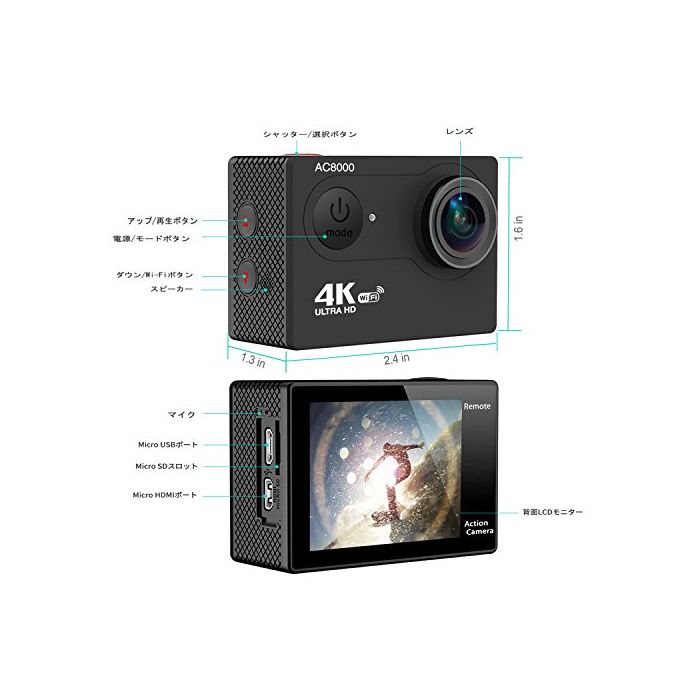 원본상품명: 4K アクションカム moonka / WIFI ウェアラブルカメラ / UHD 1200万素アクションカメラ / 2インチ背面LCDモニタ付き / 30m防水 / 170°角レンズ / リモコ
