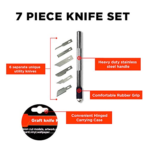 Arts and Crafts Cutting set for all your needs. Our 7 piece knife set has 6 different types of blades for a wide range of tasks and light weight rubber grip handle for comfort and precision. The variety of blades meets all your cutting needs such as scrapbooking, stenciling, carving and a lot more.