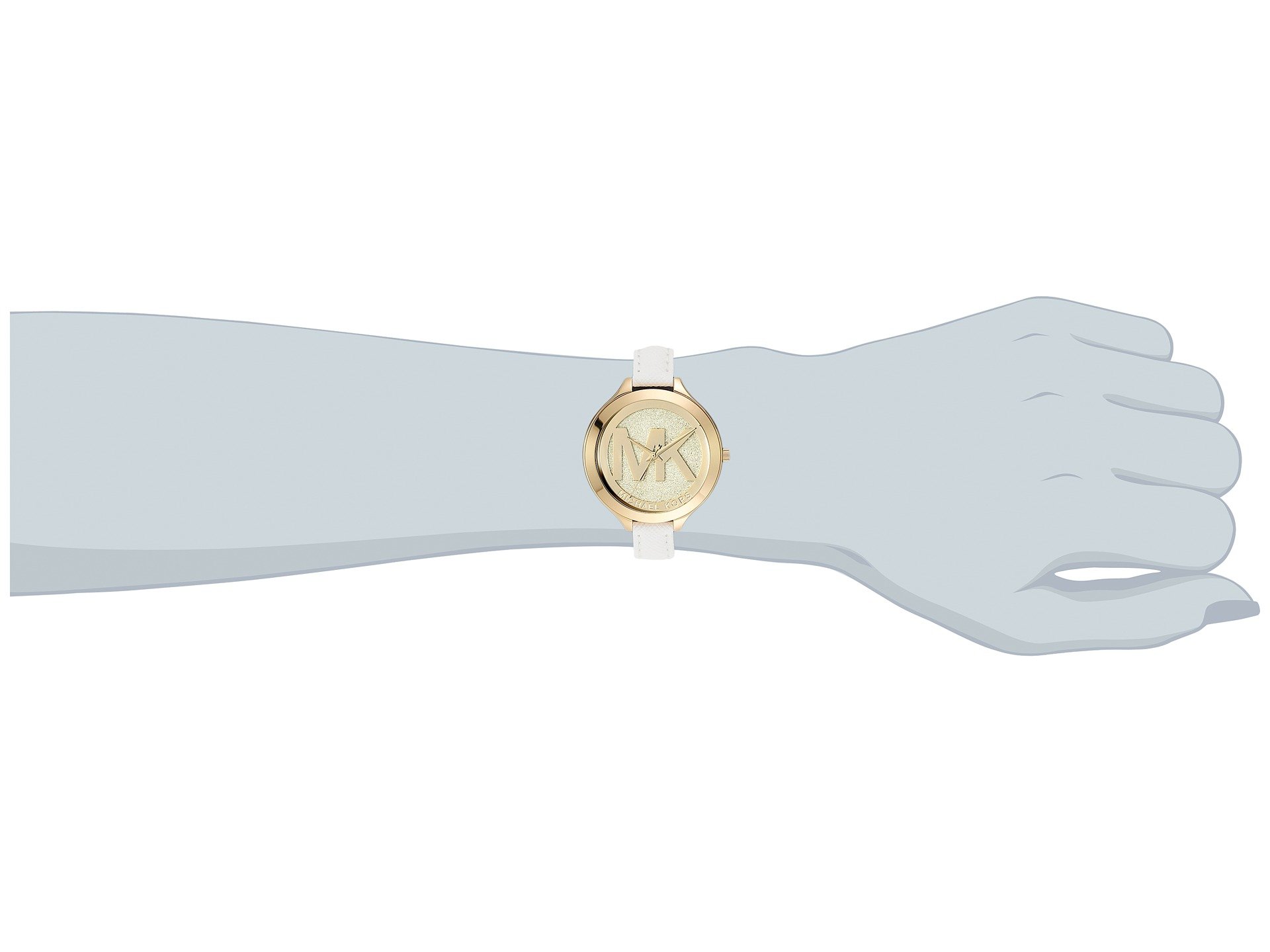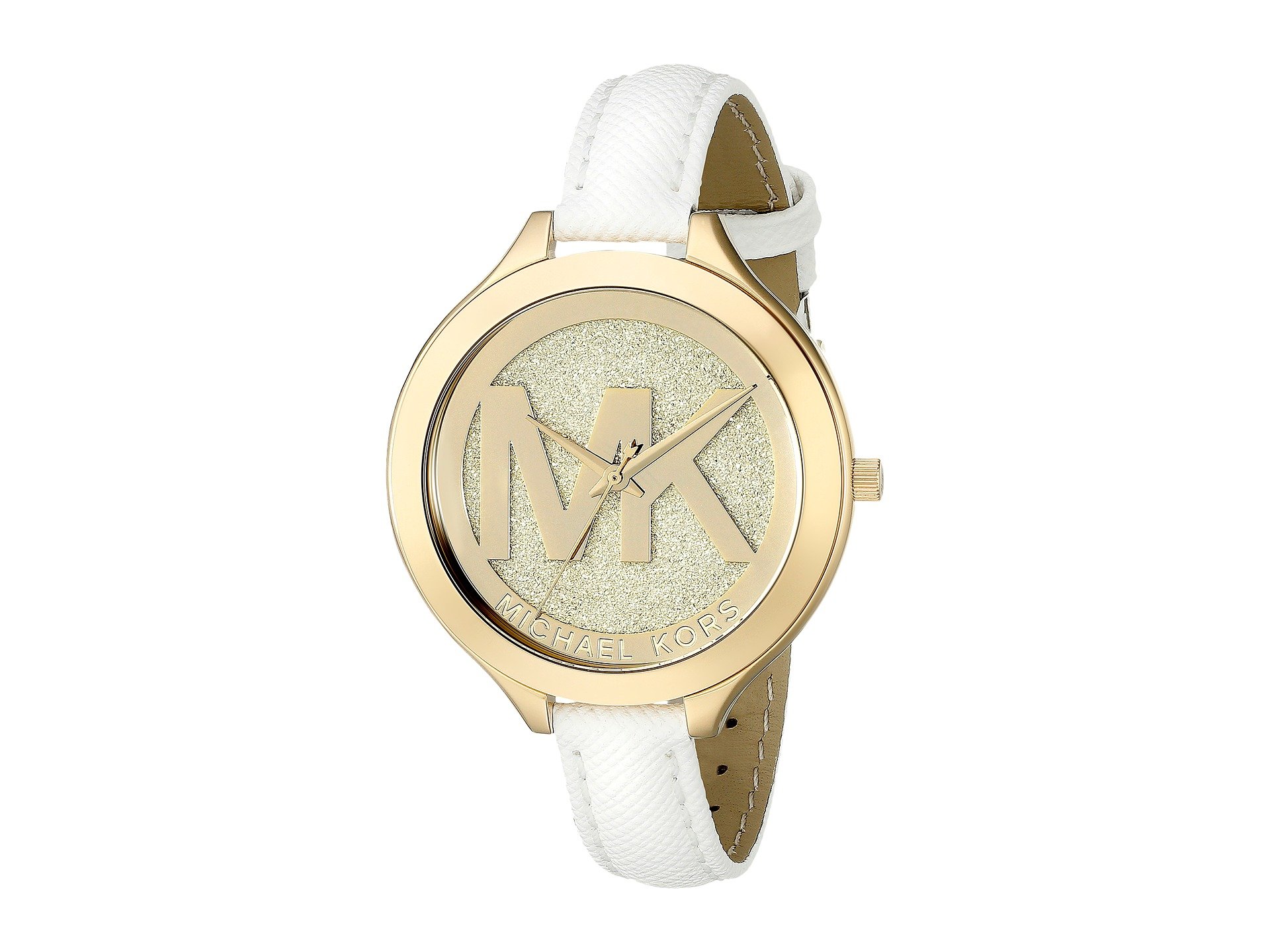 | Product Information SKU: #8535077Master the art of uptown fashion with this glitzy Michael Kors? timepiece.Gold-tone stainless steel case.Sleek white leather strap.Three-hand analog display with quartz movement.Dial face features MK brand logo and a glittering background.Water resistant 5 ATM/50 meters.Imported.This product may have a manufacturer's warranty. Please visit the manufacturer's website or contact us at warranty@support.zappos.com for full manufacturer warranty details.Measurements: Case Height: 42 mm Case Width: 42 mm Case Depth: 8 mm Band Width: 12 7?10 mm Band Circumference/Length: 9 in Weight: 2 oz |