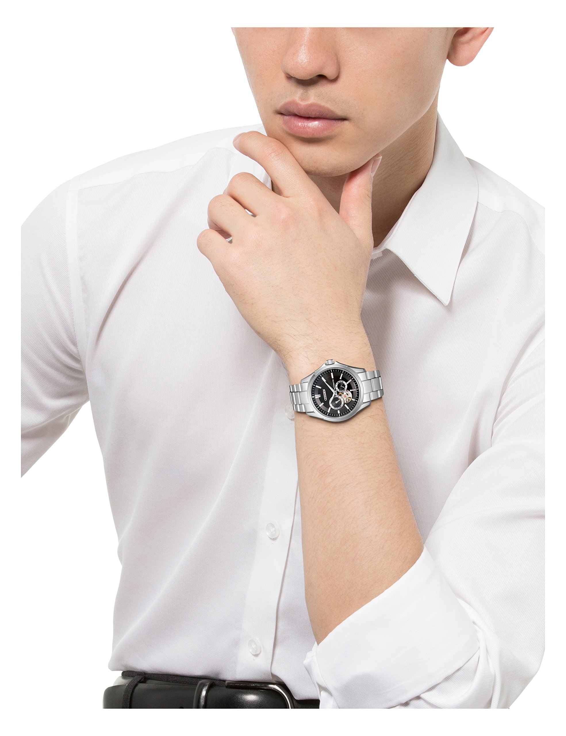 】 · Because the part of the dial plate at the 7 o'clock position is hollowed out, you can see the delicate movements of the temp that is the heart of the mechanical watch.