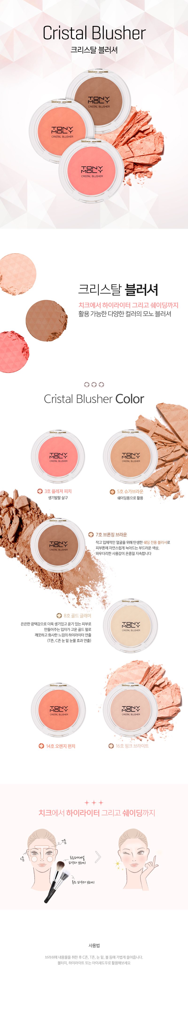 Various colors that can be used on cheeks, as a highlighter, and also for shading tocreate face contour. Naturally elegant color turnout & Long-lasting blusher.