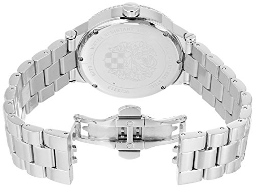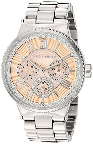 Textured peach dial with mother-of-pearl center zone; outer ring set with 71 clear Swarovski crystals; silver-tone luminous hands and Roman numerals; second, minute and 24 hour sub dials