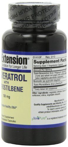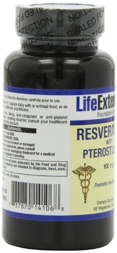 -. Binding : Health and Beauty -. Brand : Life Extension -. EAN : 0737870141068 -. Feature : Designed to maintain optimal health and to promote longevity / Resveratrol is a phytoalexin which is produced by Vitis vinifera as a response to attack by molds / Pterostilbene boosts the anti-aging effects of resveratrol -. IsAdultProduct : 0 -. Label : Life Extension -. LegalDisclaimer : * These statements have not been evaluated by the Food and Drug Administration. This product is not intended to diagnose, treat, cure or prevent any disease. **Always refer to the manufacturer's label on the product for description, recommended dose and precautions. -. Manufacturer : Life Extension -. Model : biofl0006 -. MPN : 1410 -. NumberOfItems : 1 -. PackageQuantity : 1 -. PartNumber : 1410 -. ProductGroup : Health and Beauty -. ProductTypeName : HEALTH_PERSONAL_CARE -. PublicationDate : 2011-01-12 -. Publisher : Life Extension -. Size : 60 -. Studio : Life Extension -. Title : Life Extension Resveratrol w/ Pterostilbene 100 Mg, 60 veggie capsules -. UPC : 737870141068