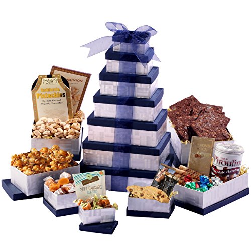 -. Feature : Great gift for birthday, thinking of you, or any occasion / Perfect gift basket for family and friends, or as a corporate office gift. / Gift tower includes: Chocolate Covered Almonds (1.75oz), Vanilla Caramels (6.5oz), Rocky Mountain Milk Chocolate Covered Oreo's (4pc), Gourmet Chocolate Drizzled Caramel Popcorn (4oz), Pirouline Chocolate Hazelnut Wafer Rolls (3.25oz), Brown and Haley Almond Roca Butter Crunch (2 pc), Nature's Joy Pistachios (1.5oz), Old Fashion Peanut Crunch (3oz), Brownie Brittle - Salted Caramel (5oz), Assorted Fruit Flashers (5.75oz) / GIFT TOWER DIMENSIONS: 8" x 5" x 18 / Kosher Certified OK D. Giving a kosher gift ensures that all recipients can enjoy and partake in your gift.