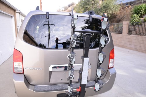Allen Sports' Premier Hitch Mounted 5-bike carrier mounts quickly and easily to your 2" trailer hitch. The arms "snap" into place right out of the box. Allen's new dual-compound cradle system securely holds your bicycles in place and the rack's large padded Spine Shield protects your bicycles as well. In addition to the easy folding arms on this rack, the new innovative internal tilt-away release makes it a snap to access your vehicle's rear lift gate. The powder-coated rack installs in just minutes with a no-wobble bolt and an integrated locking loop offers a place to secure your bikes.Feature