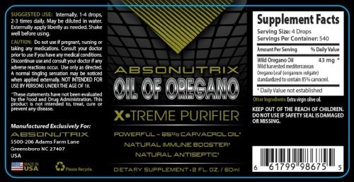 -. Binding : Health and Beauty -. Brand : Absonutrix Oil of Oregano Xteme purifier -. EAN : 0661799986755 -. Feature : wild oregano oil 43mg 2 Fl Oz / Extra virgin oil / 85%Carvacrol oil / Made in USA -. IsAdultProduct : 0 -. Label : Absonutrix -. LegalDisclaimer : -This product is not intended to treat, diagnose, prevent, or cure any disease or medical condition. -These statements have not been verified by FDA. -. Manufacturer : Absonutrix -. PackageQuantity : 2 -. ProductGroup : Health and Beauty -. ProductTypeName : HEALTH_PERSONAL_CARE -. Publisher : Absonutrix -. Studio : Absonutrix -. Title : 2bottles Absonutrix Oil of Oregano xtreme purifier 85% carvacrol oil 100% pure 2OZ pharmaceutical grade -. UPC : 661799986755
