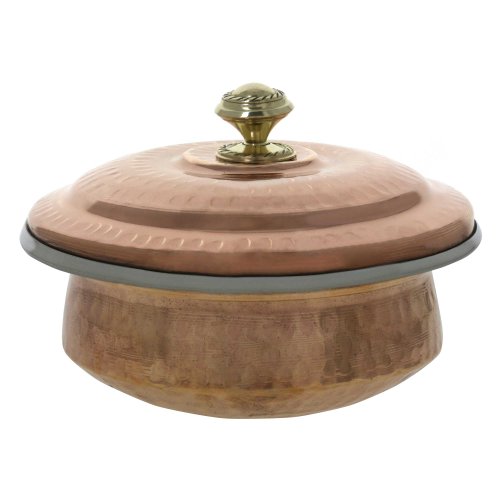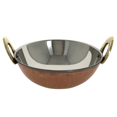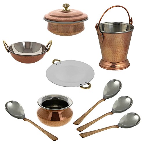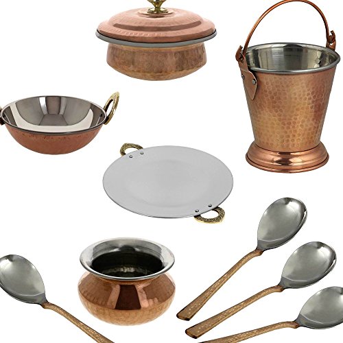 SHALININDIA INDIAN CENTERPIECE COPPER TABLEWARE TAVA KARAHI HANDI DONGA BALTI SPOONS SET BROWN