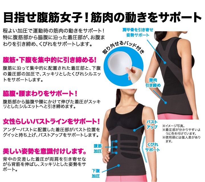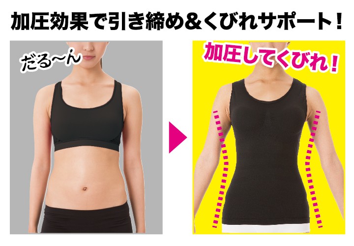 | 商品説明 | 加圧効果で引き締め&くびれサポート! ・腹部や骨盤周りに配置された着圧で、着るだけで体をすっきり引き締める! ・背筋のクロスの着圧で姿勢を正し、バストアップも! ・取り外しできるパッド付き |