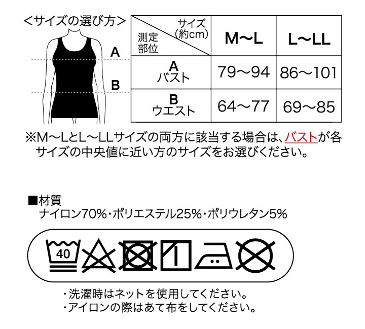 | 適応サイズ | M~L :バスト 79~ 94cm・ウエスト64~77cm L~LL: バスト 86~ 101cm・ウエスト69~85cm |