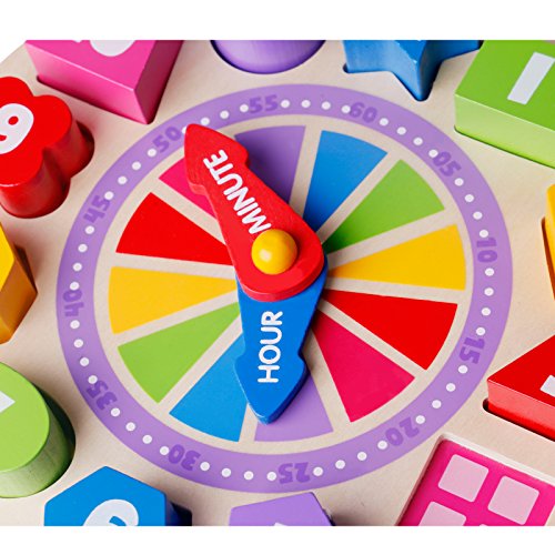 There are 12 different shaped wooden number pieces fit into matching slots, plus minute and hour hands rotate encouraging realistic practice