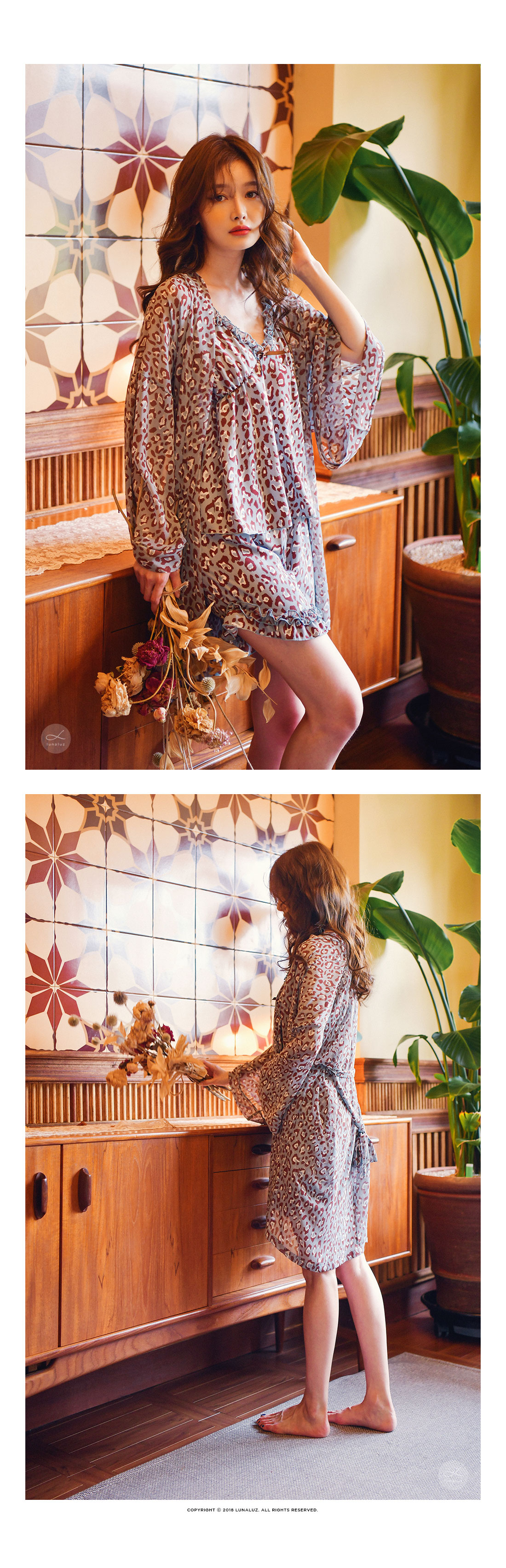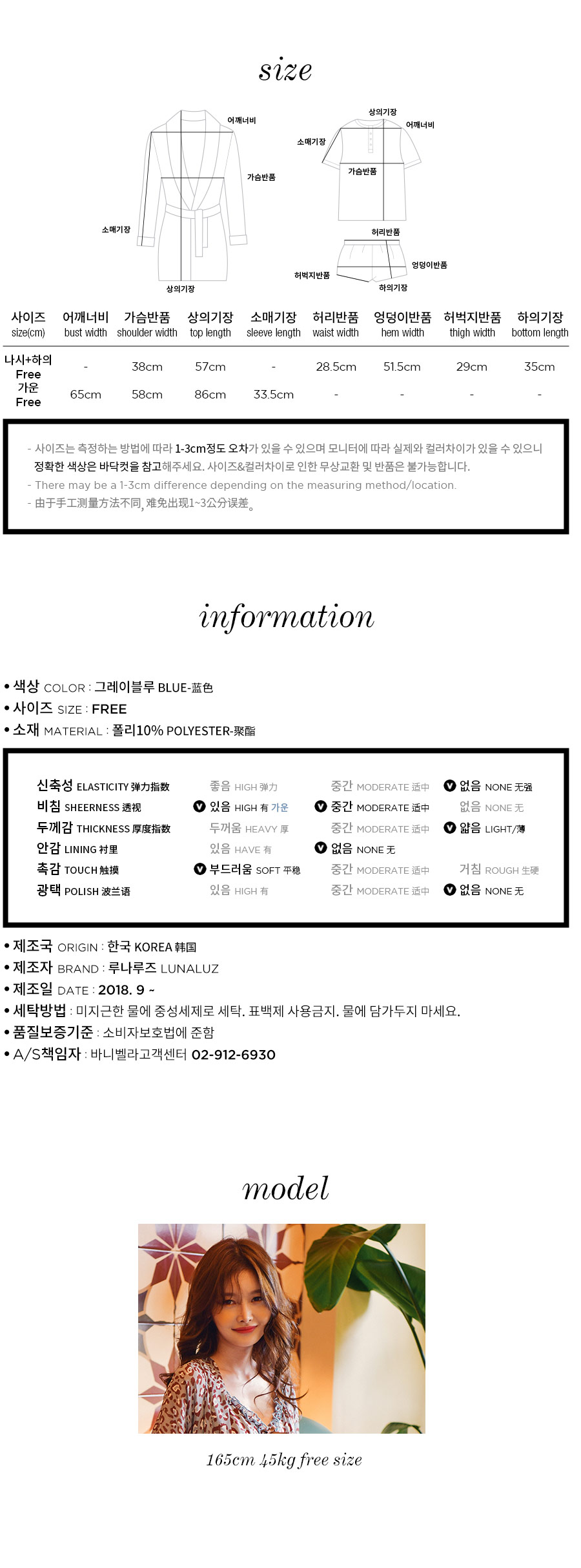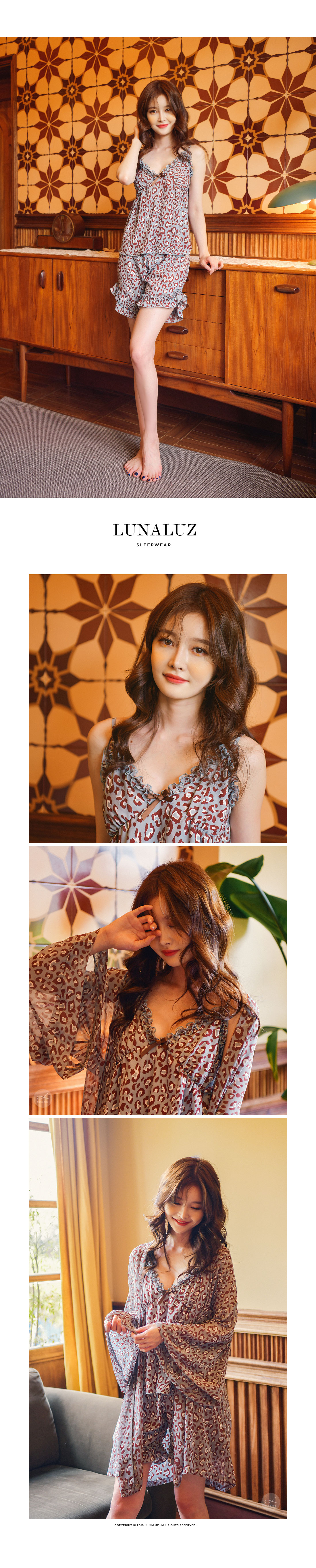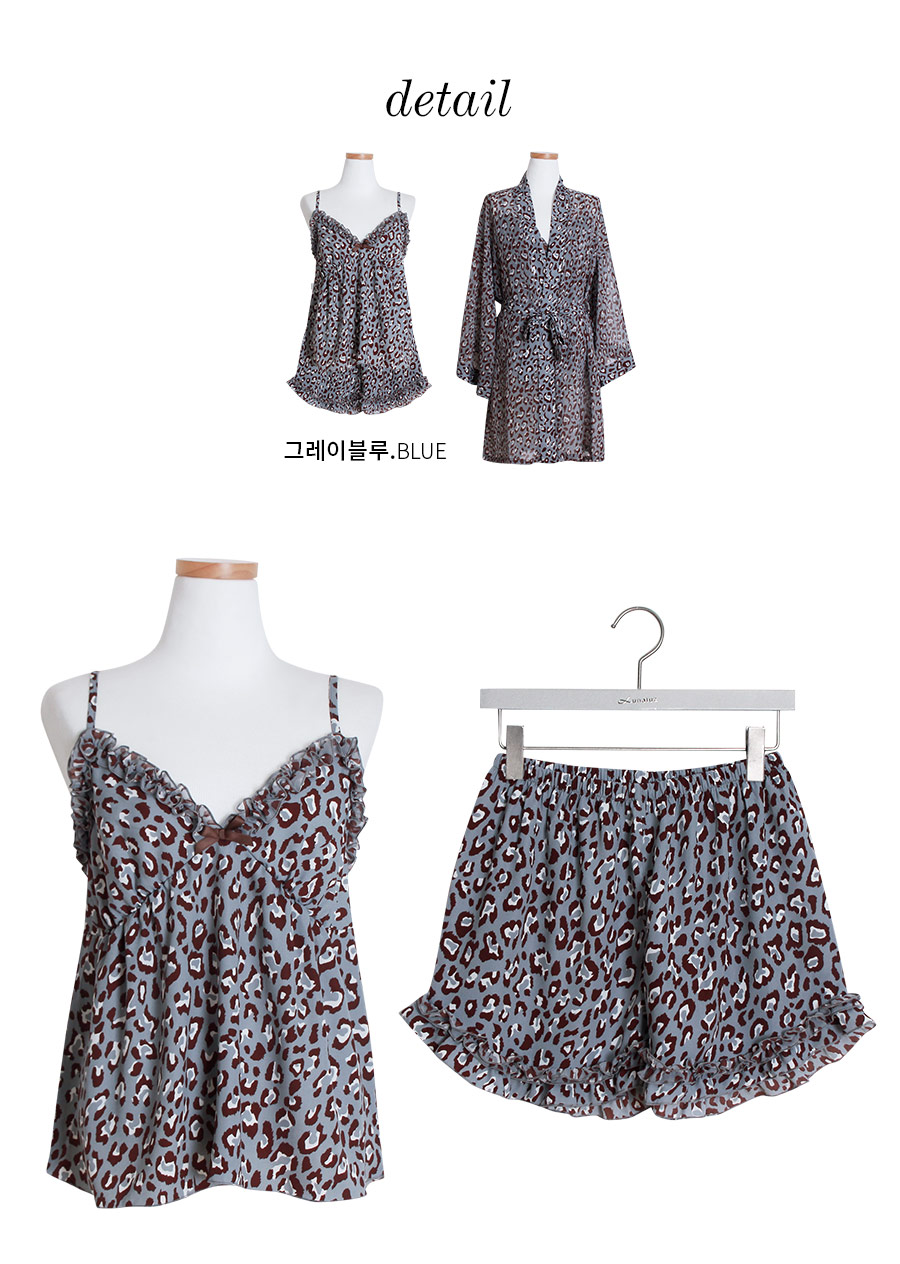 네츄럴하고 부드러운 광택이 도는 캐미솔, 쉬폰소재로 제작한 로브가 잘 어우러져 스타일리쉬한 분위기를 내어주는 set랍니다. 이번 시즌 유행하는 애니멀 패턴으로 트렌디하면서 섹시하게 연출하실 수 있습니다. 가볍고 실키한 소재로 피부에 닿는 느낌이 좋습니다. 컬러는 살짝 그레이빛이 도는 블루 컬러로 오묘하면서 세련된 무드를 내어줍니다. DETAIL 실루엣을 더욱 예쁘게 만들어주는 자체 패턴으로 바스트 라인은 볼륨감 있게 셔링을 잡아주었습니다. 3부 쇼츠는 끝 선을 곡선으로 잘라 제작해 세심하게 디자인 했다는 것을 보실 수 있을 거에요. 쉬폰 로브는 낙낙하고 여유있는 핏으로 무심하게 툭 걸쳐 입으셔도 예쁘고, 묶어서 착용할 수 있습니다. 두루두루 다양하게 연출할 수 있답니다. 하나쯤 포인트로 소장하셔도 좋고, 기분전환으로 계속 꺼내 입을 수 있는 set로 강력추천 해드립니다. 100% 국내 제작으로 소재, 디자인, 봉제의 퀄리티가 높습니다. SIZE 44반~66Ssize까지 커버 가능한 free사이즈입니다.