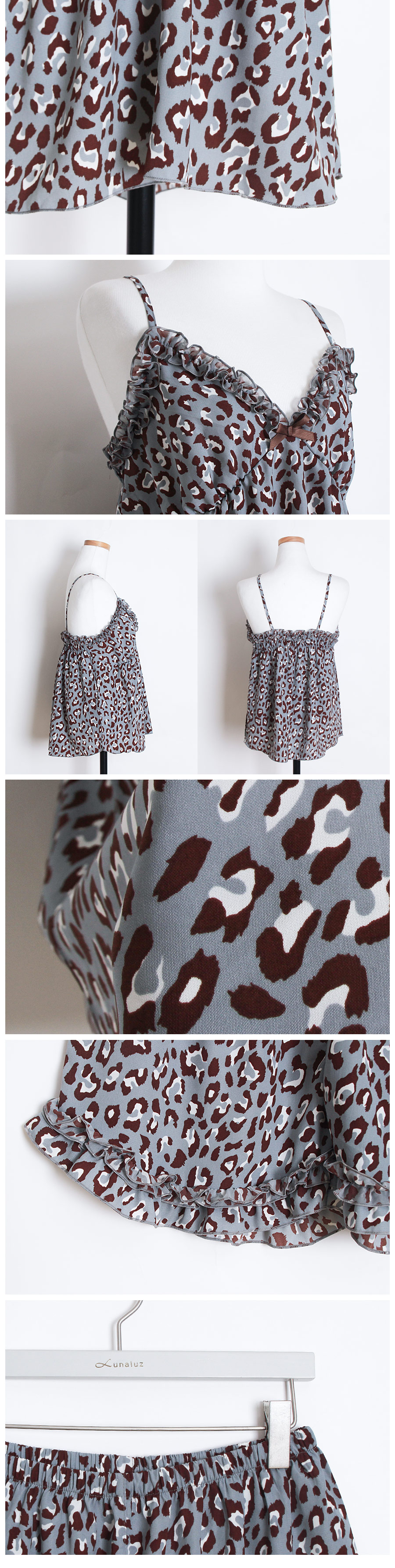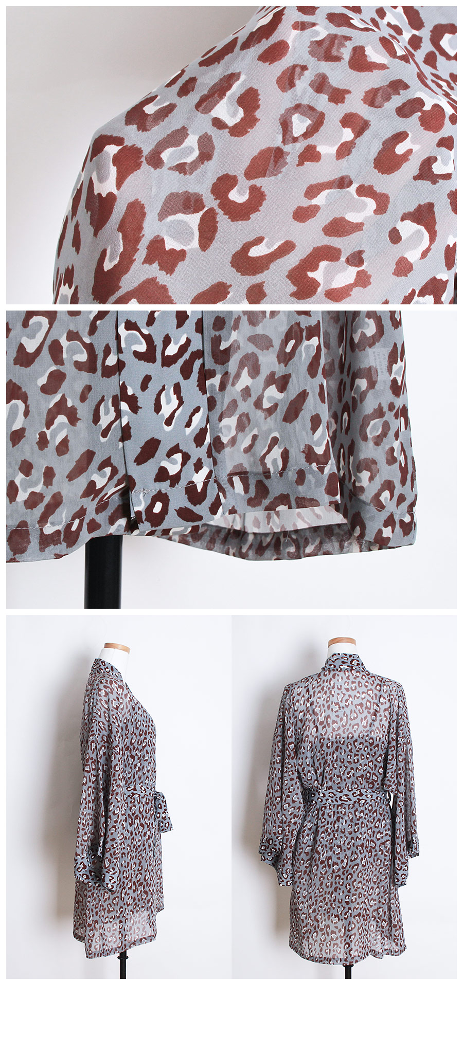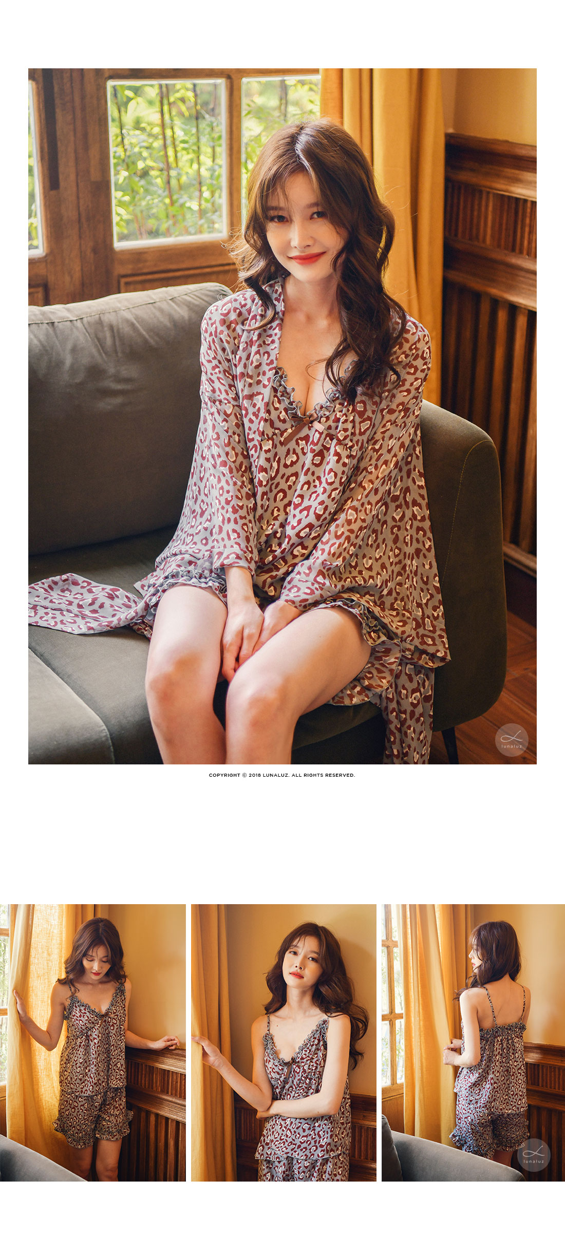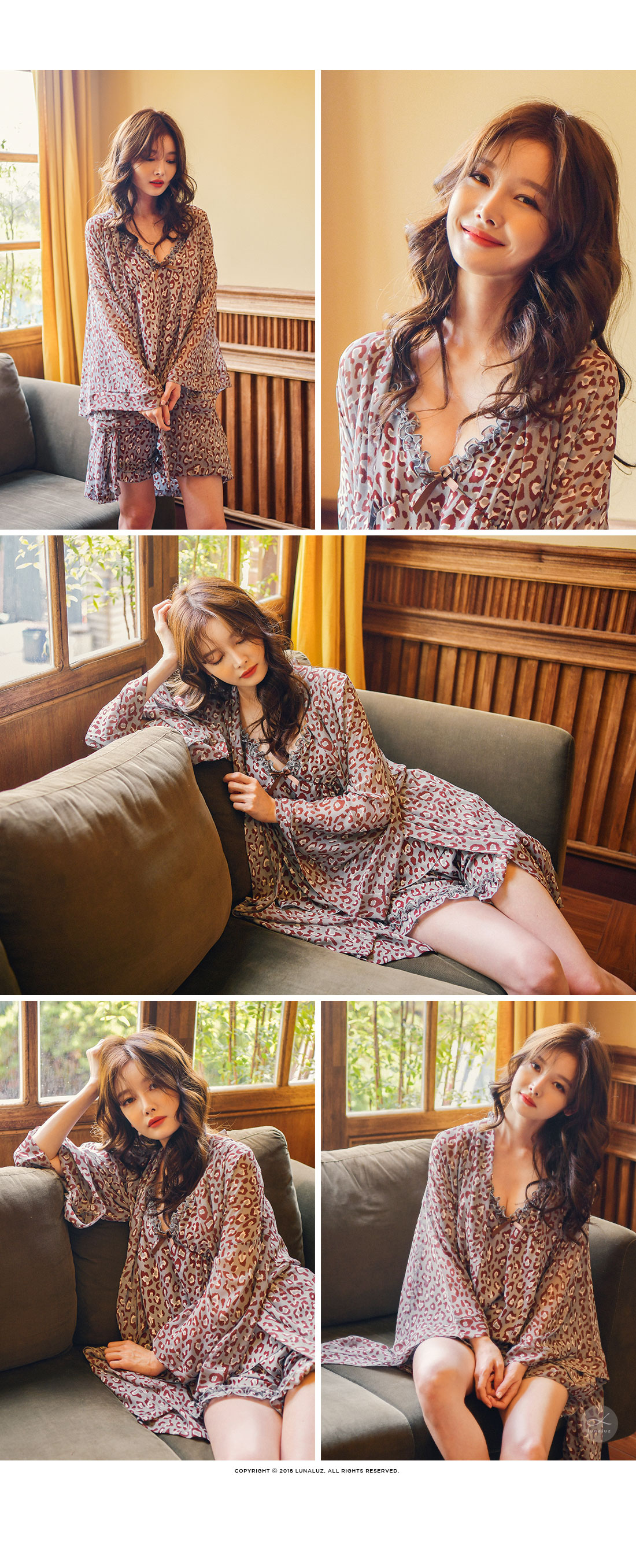 네츄럴하고 부드러운 광택이 도는 캐미솔, 쉬폰소재로 제작한 로브가 잘 어우러져 스타일리쉬한 분위기를 내어주는 set랍니다. 이번 시즌 유행하는 애니멀 패턴으로 트렌디하면서 섹시하게 연출하실 수 있습니다. 가볍고 실키한 소재로 피부에 닿는 느낌이 좋습니다. 컬러는 살짝 그레이빛이 도는 블루 컬러로 오묘하면서 세련된 무드를 내어줍니다. DETAIL 실루엣을 더욱 예쁘게 만들어주는 자체 패턴으로 바스트 라인은 볼륨감 있게 셔링을 잡아주었습니다. 3부 쇼츠는 끝 선을 곡선으로 잘라 제작해 세심하게 디자인 했다는 것을 보실 수 있을 거에요. 쉬폰 로브는 낙낙하고 여유있는 핏으로 무심하게 툭 걸쳐 입으셔도 예쁘고, 묶어서 착용할 수 있습니다. 두루두루 다양하게 연출할 수 있답니다. 하나쯤 포인트로 소장하셔도 좋고, 기분전환으로 계속 꺼내 입을 수 있는 set로 강력추천 해드립니다. 100% 국내 제작으로 소재, 디자인, 봉제의 퀄리티가 높습니다. SIZE 44반~66Ssize까지 커버 가능한 free사이즈입니다.