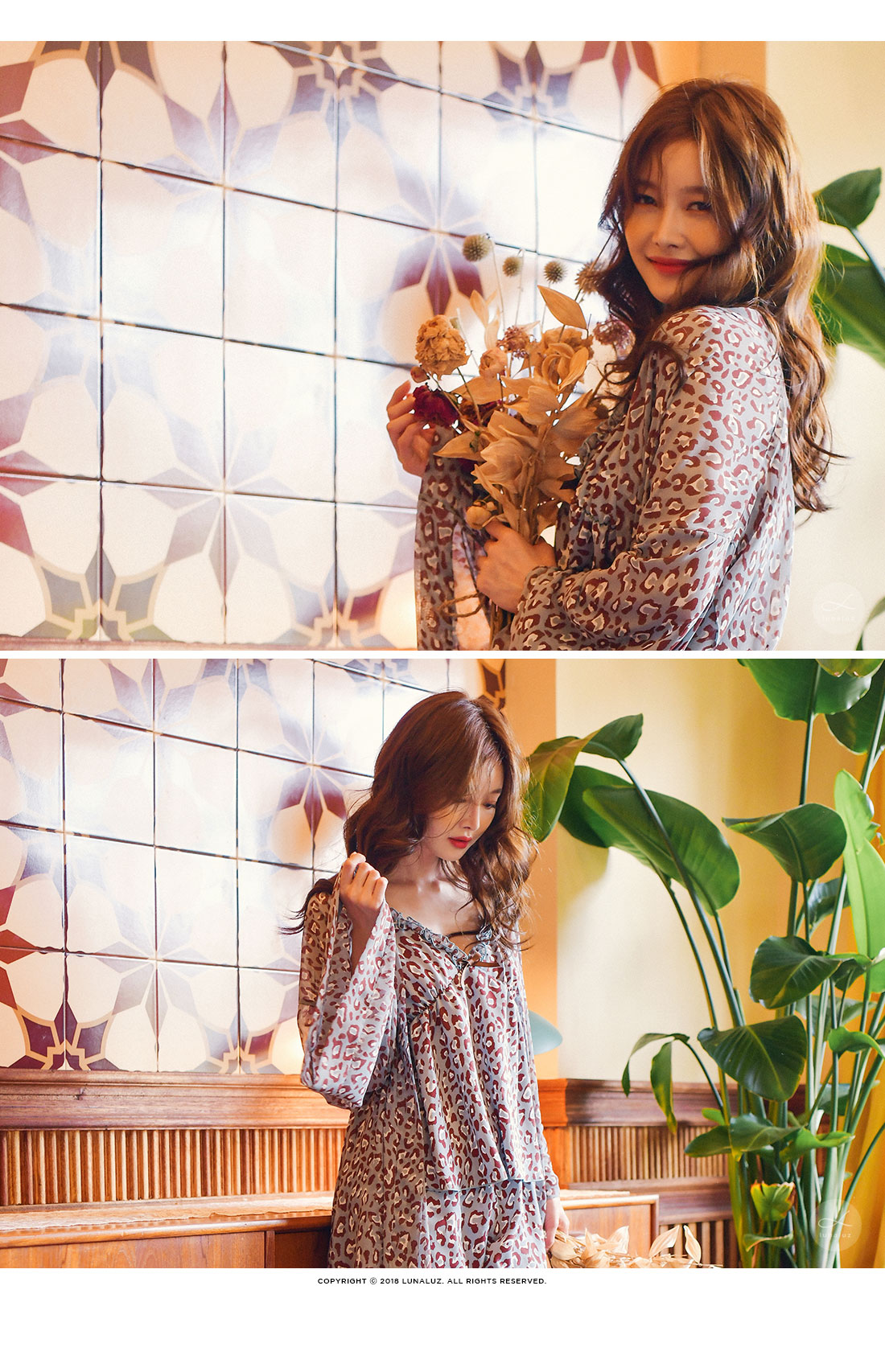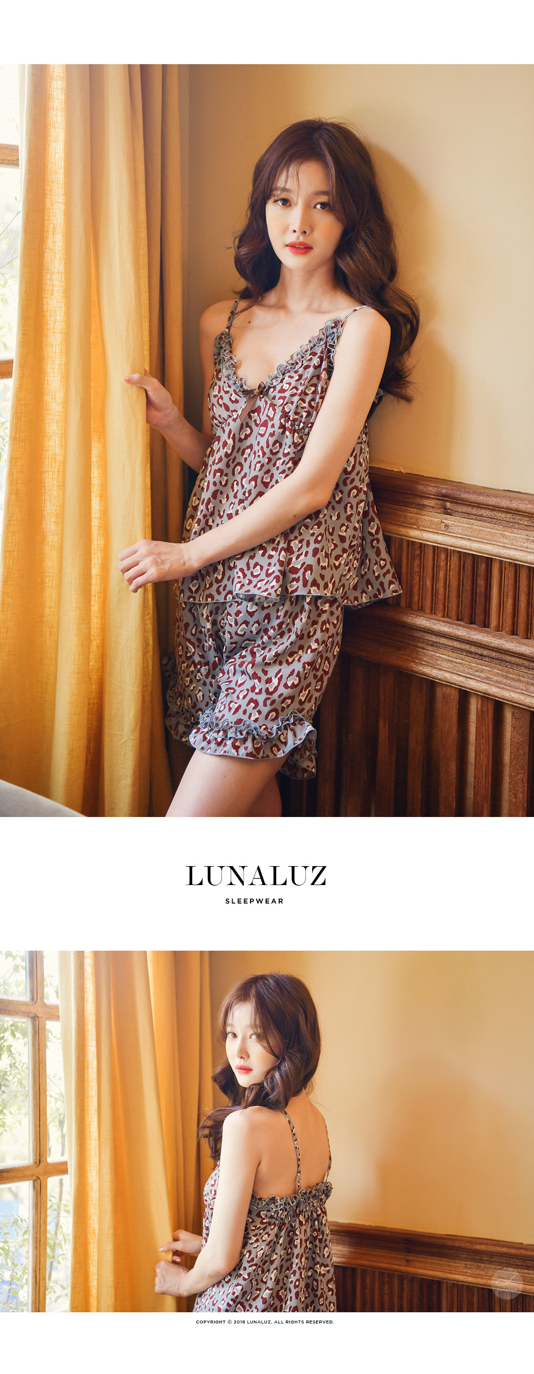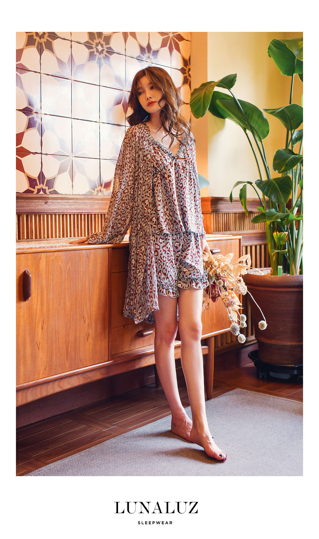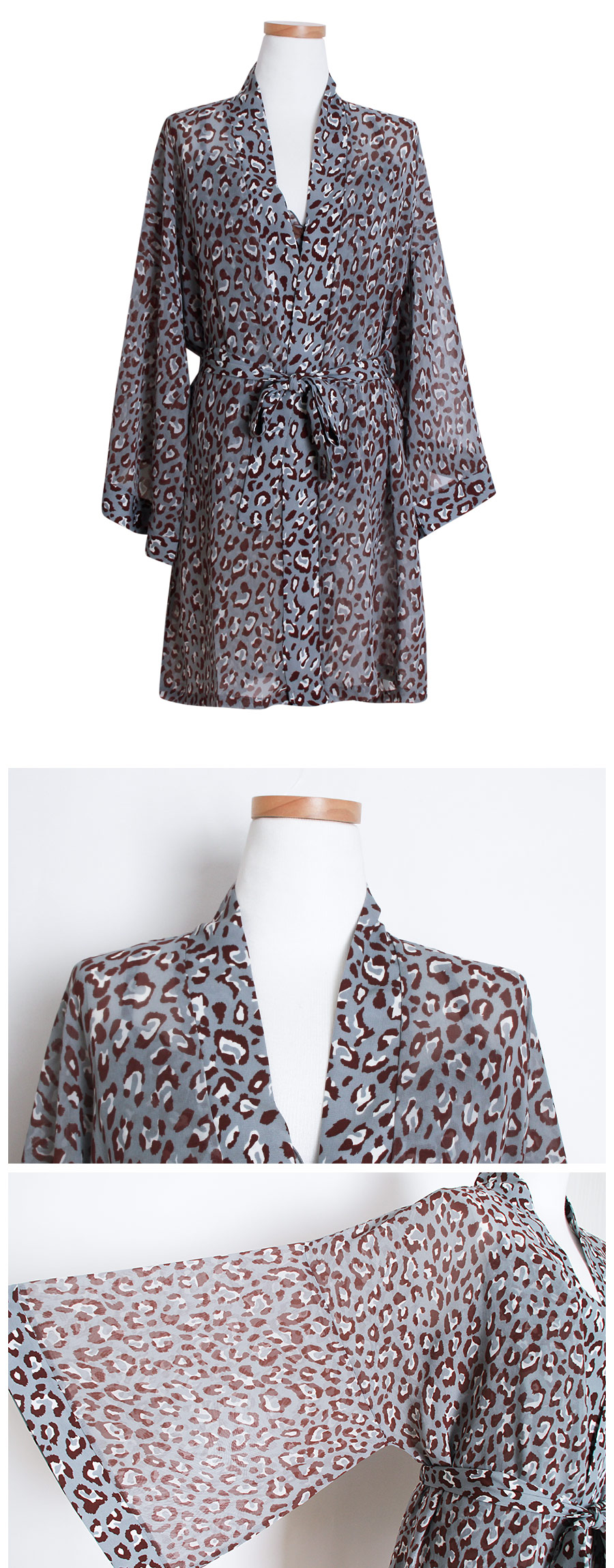 네츄럴하고 부드러운 광택이 도는 캐미솔, 쉬폰소재로 제작한 로브가 잘 어우러져 스타일리쉬한 분위기를 내어주는 set랍니다. 이번 시즌 유행하는 애니멀 패턴으로 트렌디하면서 섹시하게 연출하실 수 있습니다. 가볍고 실키한 소재로 피부에 닿는 느낌이 좋습니다. 컬러는 살짝 그레이빛이 도는 블루 컬러로 오묘하면서 세련된 무드를 내어줍니다. DETAIL 실루엣을 더욱 예쁘게 만들어주는 자체 패턴으로 바스트 라인은 볼륨감 있게 셔링을 잡아주었습니다. 3부 쇼츠는 끝 선을 곡선으로 잘라 제작해 세심하게 디자인 했다는 것을 보실 수 있을 거에요. 쉬폰 로브는 낙낙하고 여유있는 핏으로 무심하게 툭 걸쳐 입으셔도 예쁘고, 묶어서 착용할 수 있습니다. 두루두루 다양하게 연출할 수 있답니다. 하나쯤 포인트로 소장하셔도 좋고, 기분전환으로 계속 꺼내 입을 수 있는 set로 강력추천 해드립니다. 100% 국내 제작으로 소재, 디자인, 봉제의 퀄리티가 높습니다. SIZE 44반~66Ssize까지 커버 가능한 free사이즈입니다.