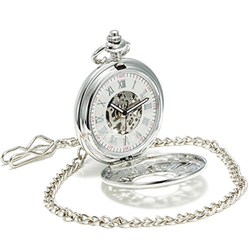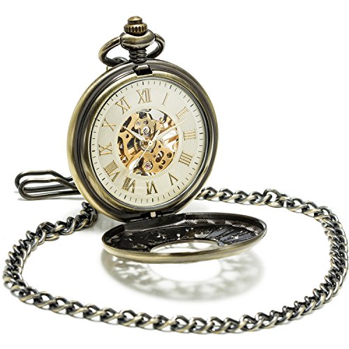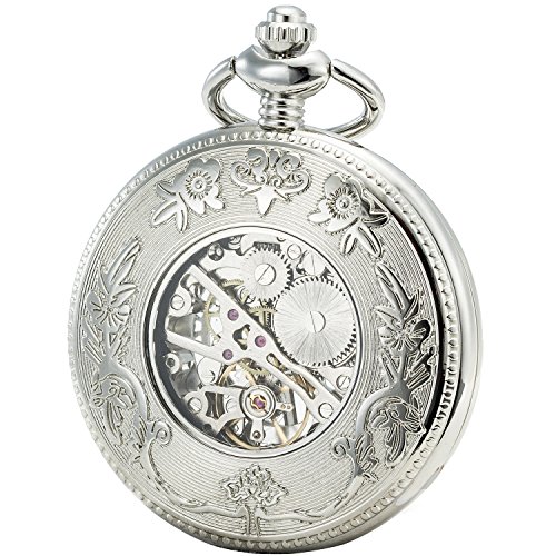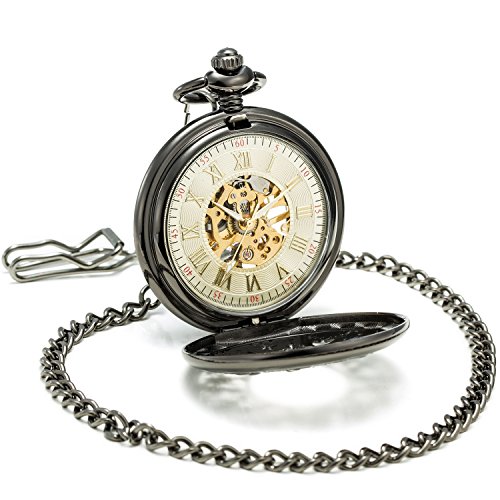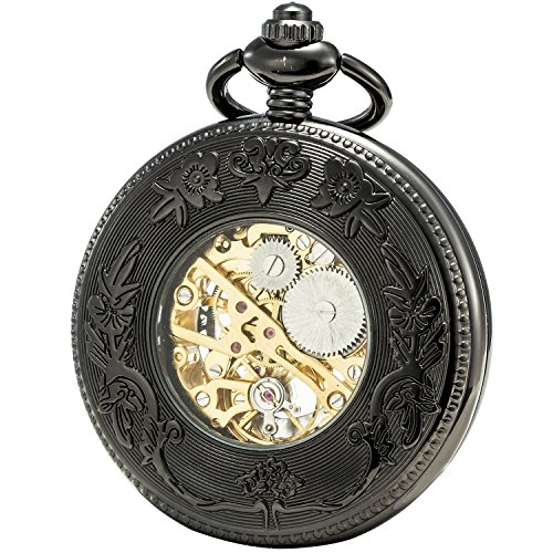 -. Title : SEWOR Grace Koi Skeleton Pocket Watch Black Mechanical Hand Wind with Leather Gift Box