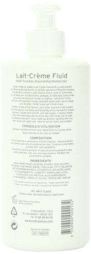 Embryolisse lait-crème concenter in fluid form hydrates and nourishes skin to re-establish the protective hydro-lipid film and repair the cutaneous surface. Result skin is rehydrated, softer and satiny. Multi-functional: this fluid, a body moisturizer, is perfect for the care and cleansing of a baby's delicate skin, or as a make-up removing cleansing face milk, an after-sun milk or even a non-greasy after-shave product for men.Feature