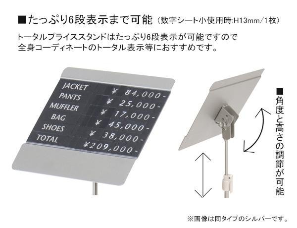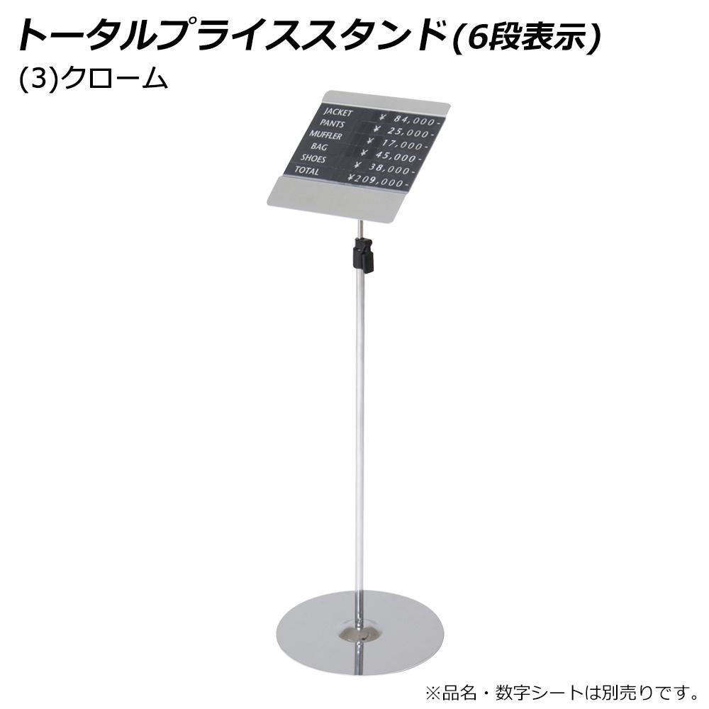 最大6段表示まで可能なトータルプライススタンドです。グレード感を高めるクロームタイプ。全身コーディネートのトータル表示等におすすめです。 |
