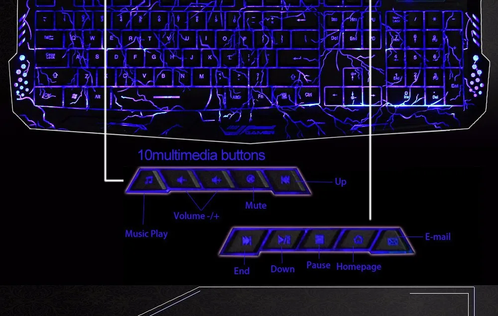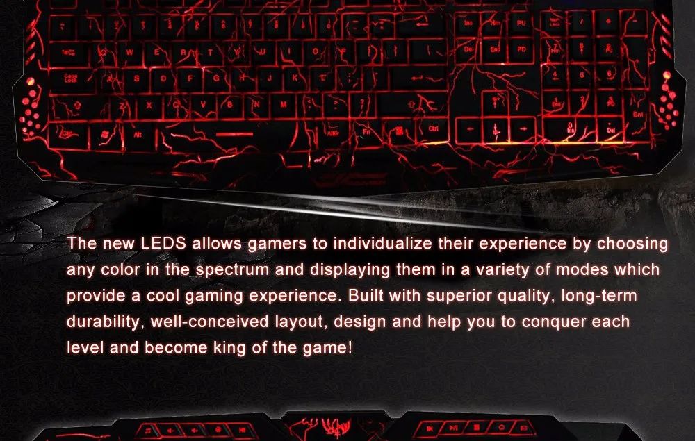 This Three Colors Backlit USB Multimedia Gaming Keyboard is about to take you to reach the new high level of a sumptuous gaming experience. Adjustable LED colors and brightness, all 3 colors can be set as full brightness (individual light control key). After gaming, 10 media keys give you fast access to your applications and settings.