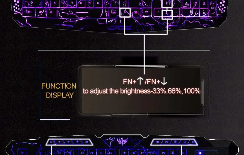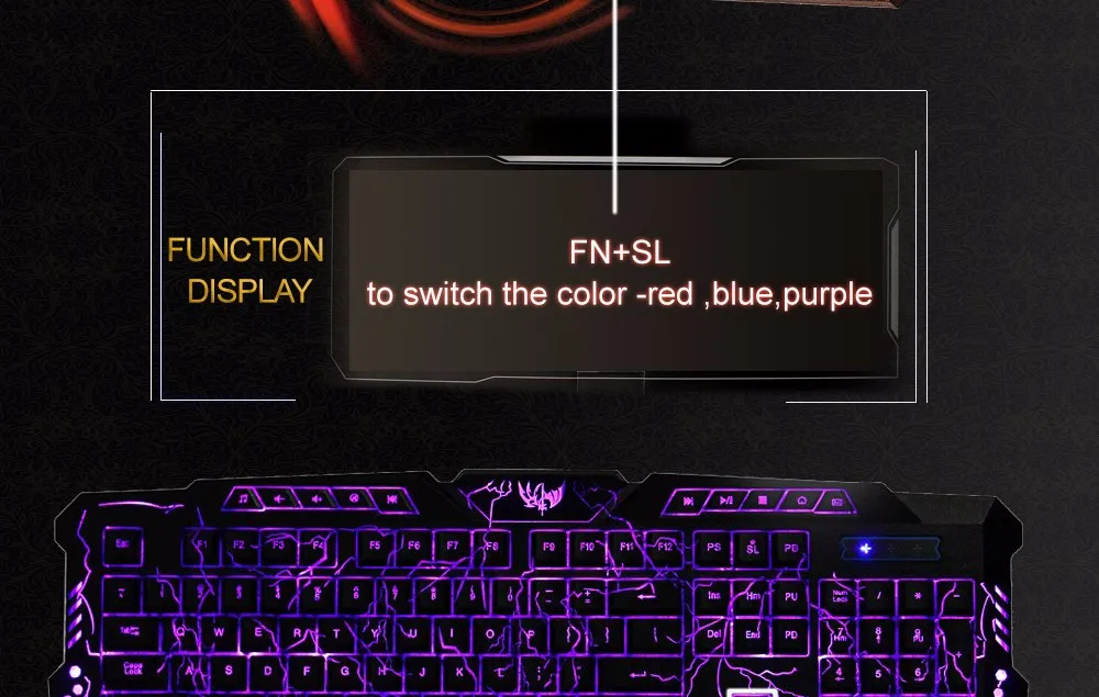 3 adjustable backlight colors, press FN + SL to switch the color, blue, purple and red color