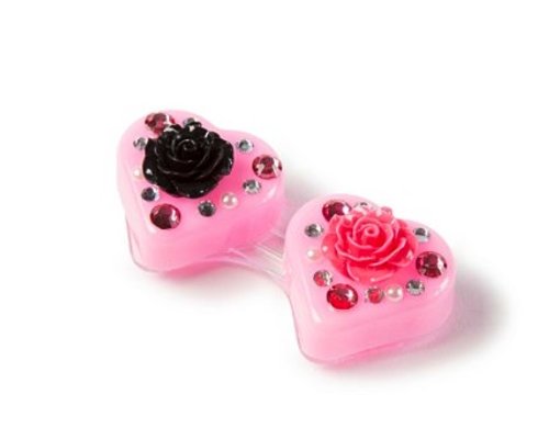 Product DescriptionThis pretty case will keep contacts safe while decorating your room. Two pink hearts have carved roses on them, one black, one pink and each have pearls plus pink and clear crystals surrounding them.0