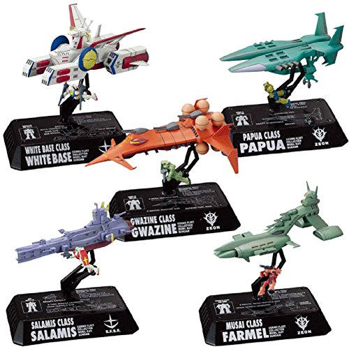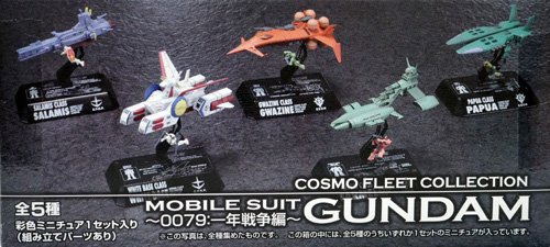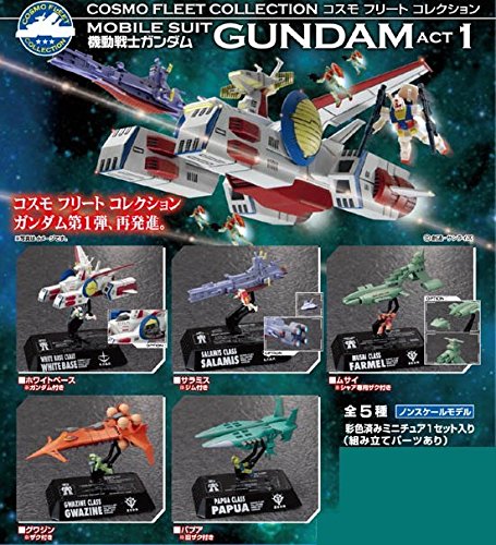메이커:메가하우스 상품명:코스모 플리트 콜렉션 기동 전사 건담 ACT.1 ~0079:1년 전쟁 편~ 전5종세트 세트내용:화이트베이스 건담 부속/《사라미스》 짐 부속/《무사이》 샤아 전용 자크 부속/《구와진》 자크 부속/파푸아 구자크 부속