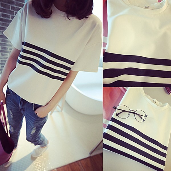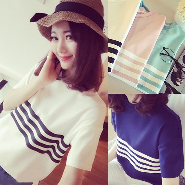 | 商品説明 | 半袖 ボーダー 4本ラインTシャツカットソー トップス♪ すっきりシルエットの4本ラインボーダーTシャツです。 着やすくカジュアルにデイリーユースできるアイテム♪ |