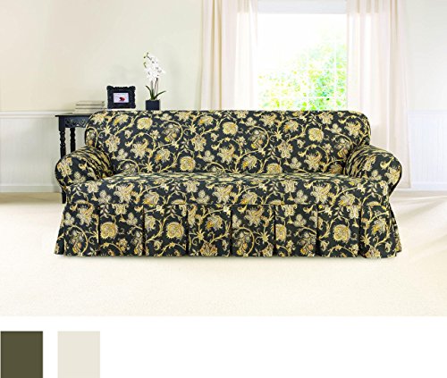 -. Binding : Misc. -. Brand : Surefit -. Color : Dark Flax -. EAN : 0047293444630 -. Feature : Relaxed fit - Woven for a slightly loose and casual look / Adjustable features that can be tucked or tied for a more tailored profile / This product has a wrinkle resist finish / Sofa arm to arm guidelines: 74-inches to 96-inches / Cord at arm and ruffle -. Label : Sure Fit Inc. -. Manufacturer : Sure Fit Inc. -. Model : SF44463 -. MPN : SF44463 -. PackageQuantity : 1 -. PartNumber : SF44463 -. ProductGroup : Home -. ProductTypeName : HOME -. Publisher : Sure Fit Inc. -. Size : Sofa -. Studio : Sure Fit Inc. -. Title : Sure Fit Tennyson 1-Piece - Sofa Slipcover - Onyx (SF44463) -. UPC : 047293444630