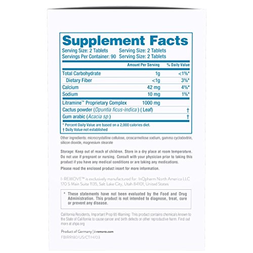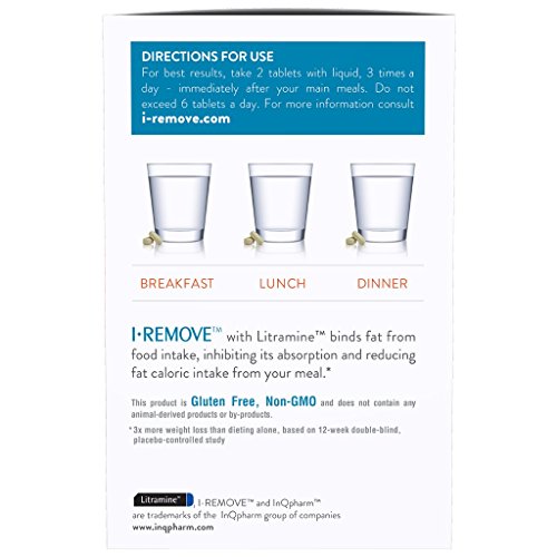 Studio : InQpharm North America Publisher : InQpharm North America Binding : Health and Beauty Product Description I-REMOVE is made with Litramine, a patented natural fiber complex. It is clinically proven to bind up to 28 percent of fat from foods. It is gentle on your body and promotes a pleasant feeling of satiety. The product contains no stimulants.