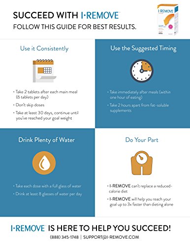 Be committed to your weight loss plan by eating better, moving more, and taking I-REMOVE consistently for at least 30 days. Take 2 tablets with liquid, 3 times a day after each meal