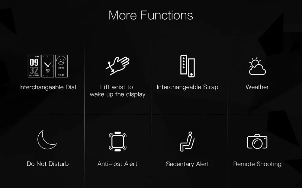 Function:Passometer,Sleep Tracker,Push Message,Heart Rate Tracker,Alarm Clock,Calculators,Remote Control,Month,Fitness Tracker,Message Reminder,Week,Call Reminder