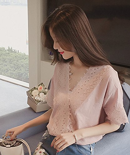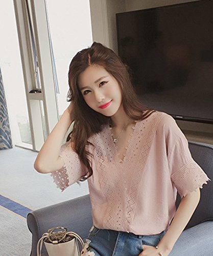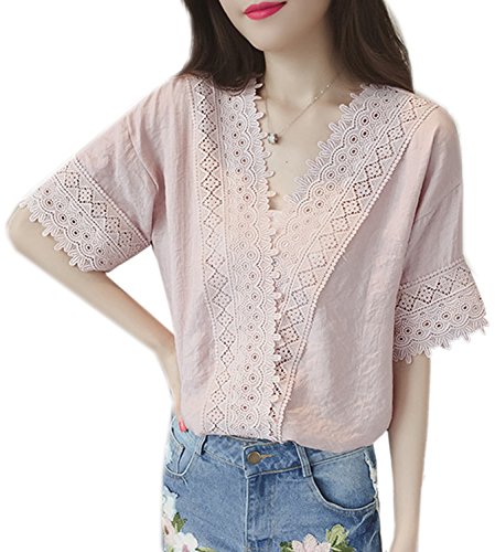 -. Feature : 深めのVネックラインと大胆なレースが特徴のトップス♪スリーブのレース仕上げが上品で涼しげな印象のブラウスです♪ / 可愛らしく華奢みえする女性らしいデザイン、また大きな五分袖は気になる二の腕をしっかりカバー!春夏に大活躍の一枚は持っておきたい人気レースブラウスです。丁寧な作りで綺麗なシルエット、着心地抜群です◎ / ポリエステルをメインに使用した素材でシワになりにくく、速乾性もあり春夏には最適です。お出かけにも、通勤や通学でもさらっと着こなせます。顔映りの良い2色のカラーをご用意。ベーシックな白は爽やかな印象に、ピンクは温かみのある印象になります♪ / 小さいサイズのSサイズから大きいサイズの3XLまで揃っています。【S】 着丈57cm バスト88cm 【M】 着丈58cm バスト92cm 【L】 着丈59cm バスト96cm 【XL】 着丈60cm バスト100cm 【2XL】 着丈61cm バスト104cm 【3XL】 着丈62cm バスト108cmカラー 【 ホワイト(白) / ピンク(桃色) 】●安心安全の Amazon プライム(P.R.IME)FBA 倉庫発送ですので 24 時間対応で即日発送 通常便は送料無料です。 / 控えめな柄のレースは10代、20代、30代、40代と幅広い年齢層の方に、様々なシーンで着ていただけます。オフィス着としても◎。ジャケットを羽織ればフォーマルな印象で幼稚園、学校の行事にも活躍してくれそうなアイテムでママさんにも使い易いアイテムです。また、カジュアルなシーンでは、スキニージーンズ、ショートパンツやデニムスカートと合わせてもおすすめです。鮮やかなカラーのカプリパンツ、サブリナパンツを合わせるとスッキリした印象になります。トレンドのオーバーオールと合わせてオシャレ度UPも!ボトムスやアクセサリー、シューズ次第で大人綺麗めコーデにも幅広く活躍します☆
