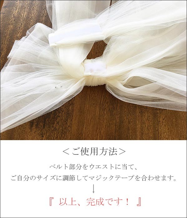 ■ご使用方法■ ベルト部分をウエストに当て、ご自分のサイズに調節してマジックテープを合わせます。 以上で完成です!(最後は、リボンの裏側に縫い付けてあるピンをベルトに留めつけてください。) |