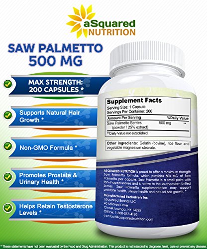 MAX STRENGTH SAW PALMETTO FORMULA WITH 500 MG OF SAW PALMETTO BERRIES PER CAPSULE AND 200 CAPSULES PER BOTTLE. *