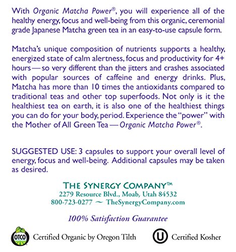 -. Binding : Health and Beauty -. Brand : The Synergy Company -. EAN : 0852971004286 -. Feature : Certified organic, ceremonial-grade Matcha green tea from Japan in capsules / Promotes concentration, focus and productivity / Provides calm alertness and a natural, "soft" energy lift for 4+ hours / Supports healthy memory and cognitive function / Antioxidant-rich with catechins and EGCG for healthy aging -. IsAdultProduct : 0 -. Label : The Synergy Company -. Manufacturer : The Synergy Company -. MPN : 1MA90 -. PackageQuantity : 1 -. PartNumber : 1MA90 -. ProductGroup : Health and Beauty -. ProductTypeName : HEALTH_PERSONAL_CARE -. Publisher : The Synergy Company -. Studio : The Synergy Company -. Title : Pure Synergy Organic Matcha Ceremonial-Grade Japanese Green Tea 90 Vegetarian Capsules by The Synergy Company -. UPC : 852971004286