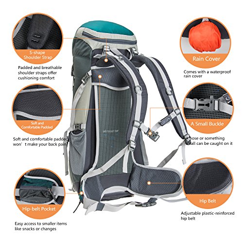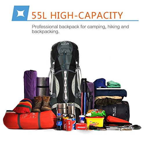 -. Feature : HIGH-CAPACITY-50+5L ; High quality professional backpack for camping, hiking and backpacking, designed to be comfortable and functionally versatile. Main compartment, secondary compartment, sleeping bag compartment, bladder compartment, hip-belt pockets, top lid pockets, and mesh side pockets to keep your stuff separate and organized. / WATER-RESISTANT- Water-resistant rip-stop nylon as the fabric can quickly slide water aside before water has a chance to penetrate it. Also a WATERPROOF rain cover stored in the bottom pocket, protect the whole pack from rain. / TOOL ATTACHMENT POINTS- D-shape hooks, compression straps, bottom loops, soft latching loops, key rings and bottom straps for hanging tools, trekking pole, tents, sleeping bags, and other accessory. / INTERNAL FRAME SYSTEM-Serves to support the pack and distribute the weight of its contents across the body more appropriately, by transferring much of the weight to the hips and legs. 8 different adjustable sizes to fit your height. D-shape hooks, compression straps, bottom loops, soft latching loops, key rings and bottom straps for hanging tools, trekking pole, tents, sleeping bags, and other accessory. / PRODUCT PARAMETERS- Weight only 4.4 lb (2.0 kg). Four colors available: Harbor Blue / Pine Green / Fire Red / Maroon. Product Dimensions: 24.4 x 13.8 x 8 inches. Includes limited 30 days manufacturer's warranty.