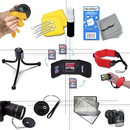 Includes a Remote control wrist strap + 2 Screen Protectors + Mini table tripod + Memory Card Wallet Case holder + Lens Cap Keeper + a cleaning pen + air blower + a Deluxe Cleaning Kit and a HeroFiber® Ultra gentle cleaning cloth designed for cleaning electronics and accessories