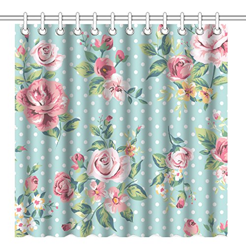 Wknoon 72 x 72 Inch Shower Curtain, Vintage Floral Design Seamless Pink Rose Flowers and White Polka Dots Art,Waterproof Polyester Fabric Decorative Bathroom Bath Curtains