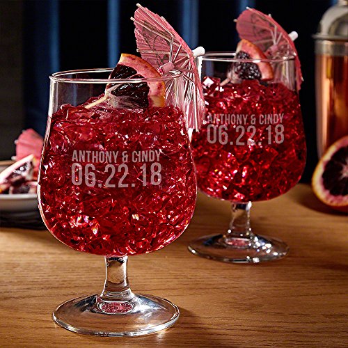 Studio : HomeWetBar Publisher : HomeWetBar Product Description Perhaps one of the most romantic ideas ever spoken is that two people in love are better together, and that's the inspiration for this set of 2 custom hurricane glasses. Ready to serve beer or cocktails in style, our Montego style hurricane glassware comes personalized with two first names and your special date. A great idea for weddings, anniversary celebrations, or just as a reminder of any romantic occasion. Each hurricane glass measures 5.75 tall with a 3.5 diameter. Made from dishwasher safe premium glass, each of the hurricane drinking glasses in this 2 piece set holds up to 15 ounces.. 0