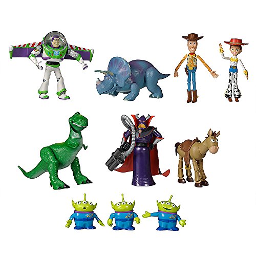 -. Feature : Genuine, Original, Authentic Disney Store / Set of 10 action figures, plus accessories / Characters include Woody, Jessie, Bullseye, Buzz Lightyear, Emperor Zurg, Rex, Trixie, and three Space Aliens / Multiple points of articulation / Comes in window display packaging