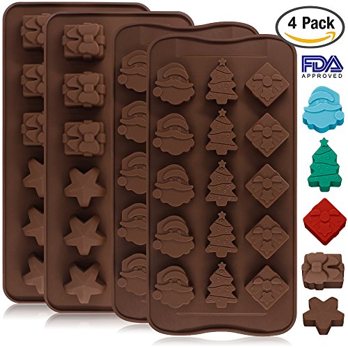 4 Pack Silicone Chocolate Candy Molds Trays, DanziX Baking Jelly Molds, Cake Decoration, with Shapes of Star, Gift Box, Christmas Tree, Santa Head - 2 Types