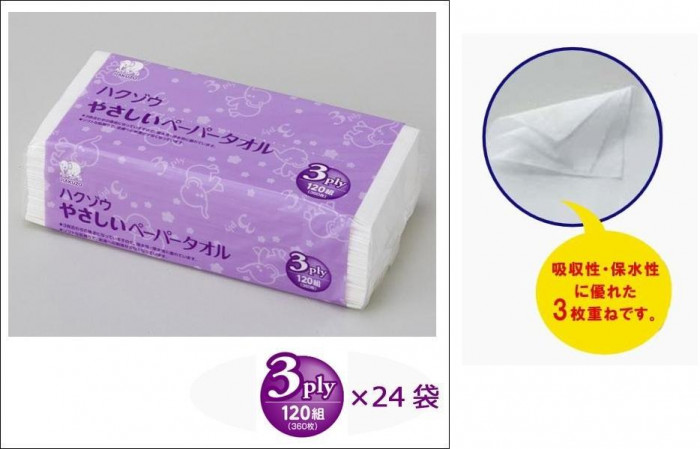 3枚1組の吸収性・保水性に大変優れた、手肌に優しいペーパータオルです。