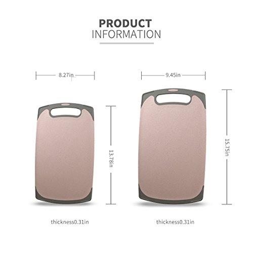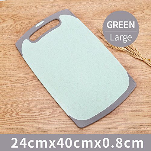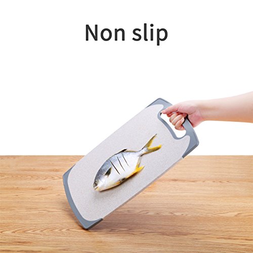 Non slip edges made of food grade plastic to reduce board movement on the bench. The surface has a block of wheat grain, can be anti slip, the rough surface helps to prevent food from slipping while cutting. Boards are very easy to manoeuvre and have a tapered handle for comfortable lifting, carrying and storage on a hook or flat in a cupboard. Durable used and lightweight.