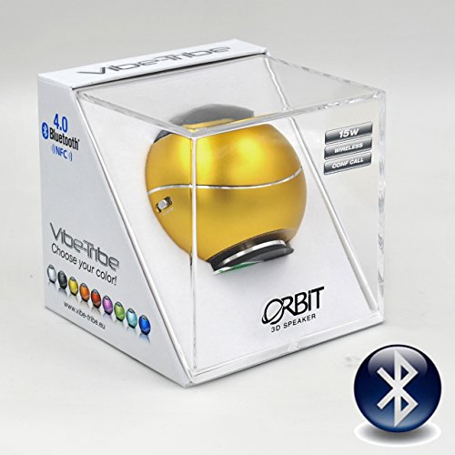-. Feature : 15W high-fidelity power ( a normal speaker of equal size reaches 3-5W ) , thanks to its " vibrating core " ultra powerful ... but absolutely portable with its small size in just 6.5 x 7.5 cm ! His extraordinary and patented "core" project sound to the surfaces on which Orbit lays, transforming it into effective and sound sources . / Optimal and secure support with the unique patented suction cup that adheres to smooth surfaces turning in exceptional source for the popular Vibe - Tribe " 3D sound" . / It contains the Bluetooth 4.0 technology and NFC ( Near Field Communication ), which lets you connect with a simple touch. Orbit is updated to all the latest Bluetooth protocols A2DP , AVRCP and HFP for a simple and complete control . / Conf-call function turns your desk into a single large conference auditorium! Orbit is equipped with a last generation echo-canceling microphone. / Unique design , with elegant and sinuous lines , characterized by a structure in aluminum and chrome details ... in a range of 9 exclusive exclusive shades.