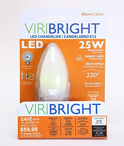 Viribright 74555 LED 25 Watt Light Bulbs Equivalent Incandescent, Candelabra Bulb, Small Base E12 Warm White 2700K, 270 Lumens , Chandelier, 6 Pack