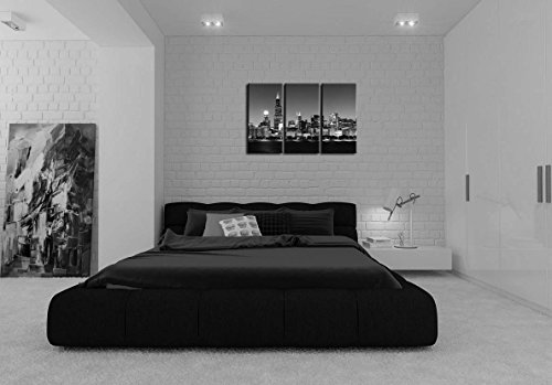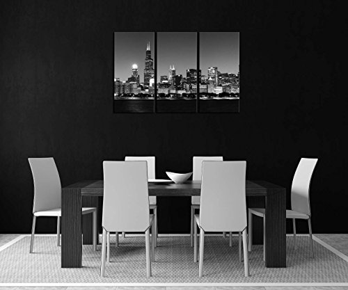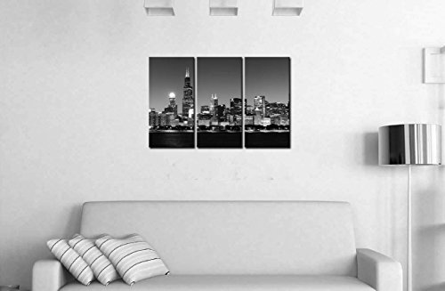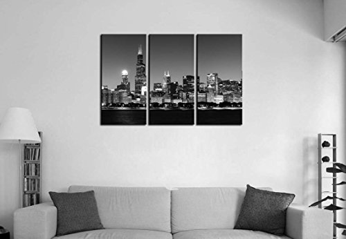 -. Title : 3 Pieces Modern Canvas Painting Wall Art The Picture For Home Decoration Panoramic View Of Chicago Skyline At Night In Black And White Place Cityscape P.R.Int On Canvas Giclee Artwork For Wall Decor