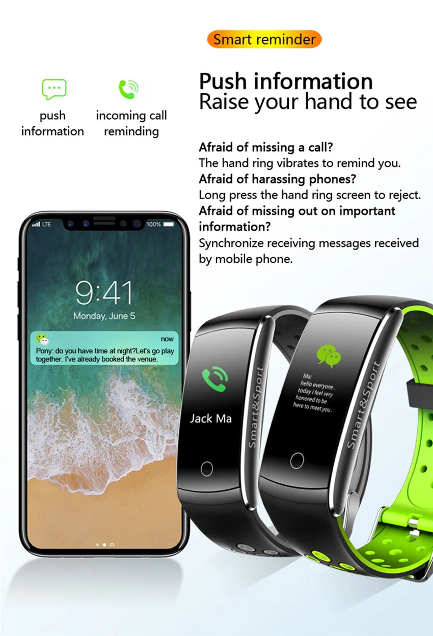 Function:Noctilucent,Passometer,Sleep Tracker,Push Message,Heart Rate Tracker,Alarm Clock,Fitness Tracker,Message Reminder,Call Reminder