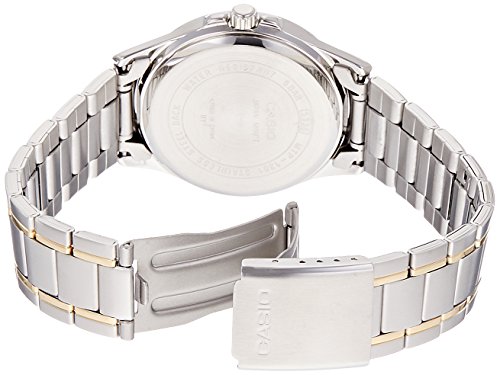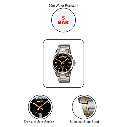 Brand, Seller, or Collection Name:Casio Model number:MTP-1381G-1AVDF (A842) Part Number:MTP-1381G-1AVDF (A842) Item Shape:Round Dial window material type:Mineral Display Type:Analog Case material:Ion Plating Case diameter:46.6 millimeters Case Thickness:8.90 Band Material:Stainless Steel Band width:20 millimeters Band Color:Silver/Gold Dial color:Black Calendar:Yes Special features:N/A Item weight:8.80 Ounces Movement:Quartz: Battery Water resistant depth:50 Meters