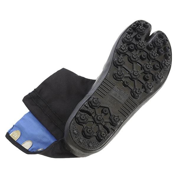 ゴムピンの大小の配置バランスによって、地面をつかむ力と歩行時の安定感を兼ね備えた地下たびです。ソール部分は耐水糊引加工が施されております。 |