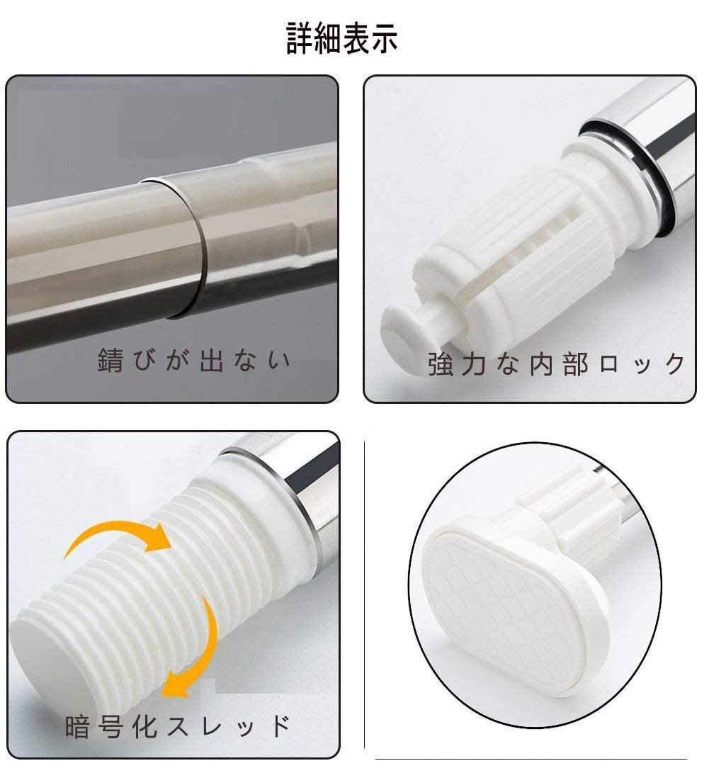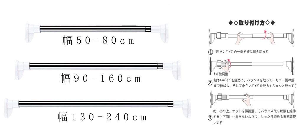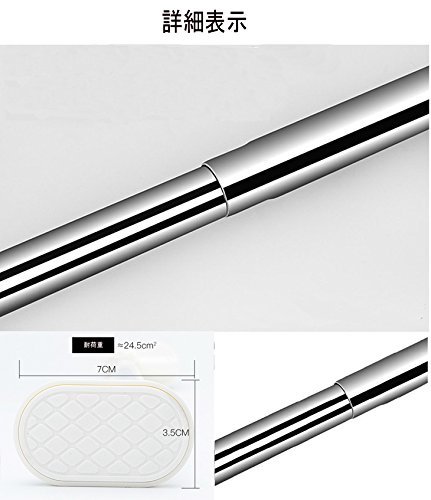 サイズ: 50-80CM ●突っ張り棒 主要材質:304ステンレス鋼管、ABS樹脂 ●つっぱり棒 商品サイズ(cm):幅約50~80×高7×奥行4cm ,耐荷重:約20~45kg(※設置する長さで変わります) ● 伸縮自在:ネジ.クギ不要で取り付けられる , 特徴: 穴を開ける必要なし、耐荷重が強い 、 錆びが出ない ●お部屋の空間を有効活用できる突っ張り棒。 洗面所、プライベートルームなどでハンガーやフックの吊り下げに便利です。