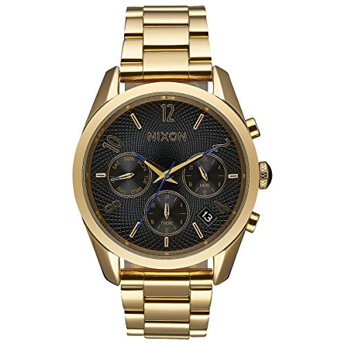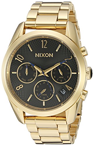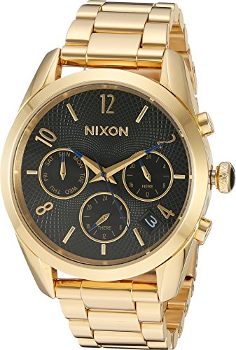 Studio : Nixon Inc. Publisher : Nixon Inc. Binding : Watch Product Description A geometric pattern accents the dial of this Nixon watch. Additional function windows for the day, date, and for 'here' and 'there' options. Polished, gold-tone links forms the band. Hinged-snap clasp. 0