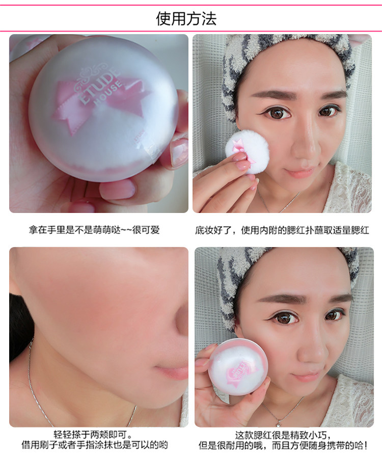 | 底妆好了之后,使用内附的腮红扑蘸取适量腮红,轻轻搽于两颊即可。 借用刷子或者手指涂抹也是可以的哟 | ||
